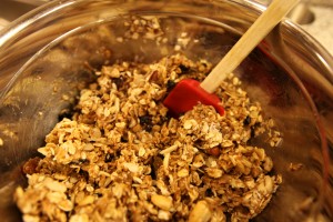 2. In a large mixing bowl, mix together oats, Rice Krispies, almonds, coconut, dried fruits, and nuts.
