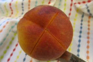 Cut a large X in the bottom of the peach