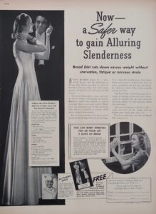 The Bread Diet — “a safer way to gain alluring slenderness.” It “cuts down excess weight without starvation, fatigue or nervous strain.” Imagine enjoying TWO slices of bread with every meal AND losing weight! Not only that, but look at what you can do with the energy you’ll get from 2 slices of bread: